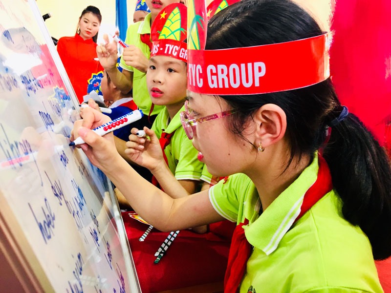 Tại phần về đích, tuy 5 gói câu hỏi tiếng Anh dành cho các đội khá hóc búa, đòi hỏi khả năng nghe, hiểu, phản ứng nhanh, song các em đều nhanh chóng đưa ra câu trả lời đúng, đầy đủ, giành những lá cờ chiến thắng.