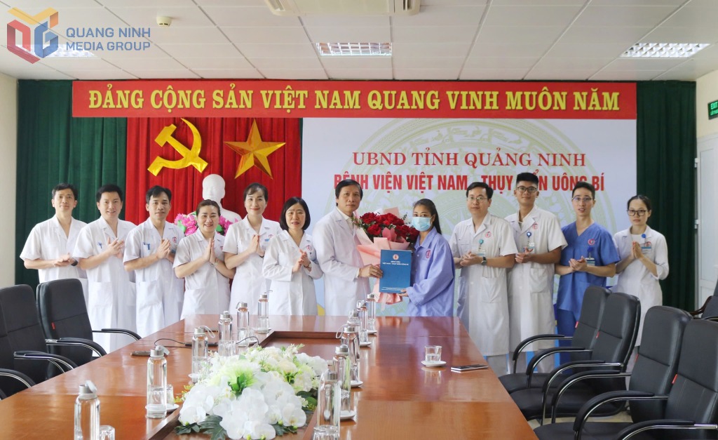 Các y, bác sĩ Bệnh viện Việt Nam - Thụy Điển Uông Bí tặng hoa chúc mừng người bệnh ghép thận đầu tiên đã ổn định sức khỏe và được xuất viện, ngày 23/4/2025.