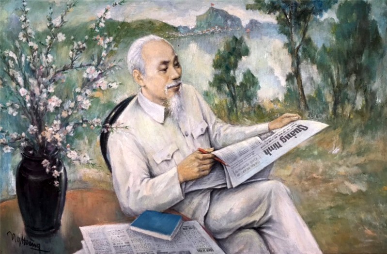 Bức tranh “Bác Hồ đọc báo Quảng Ninh” của họa sĩ Nguyễn Hoàng.