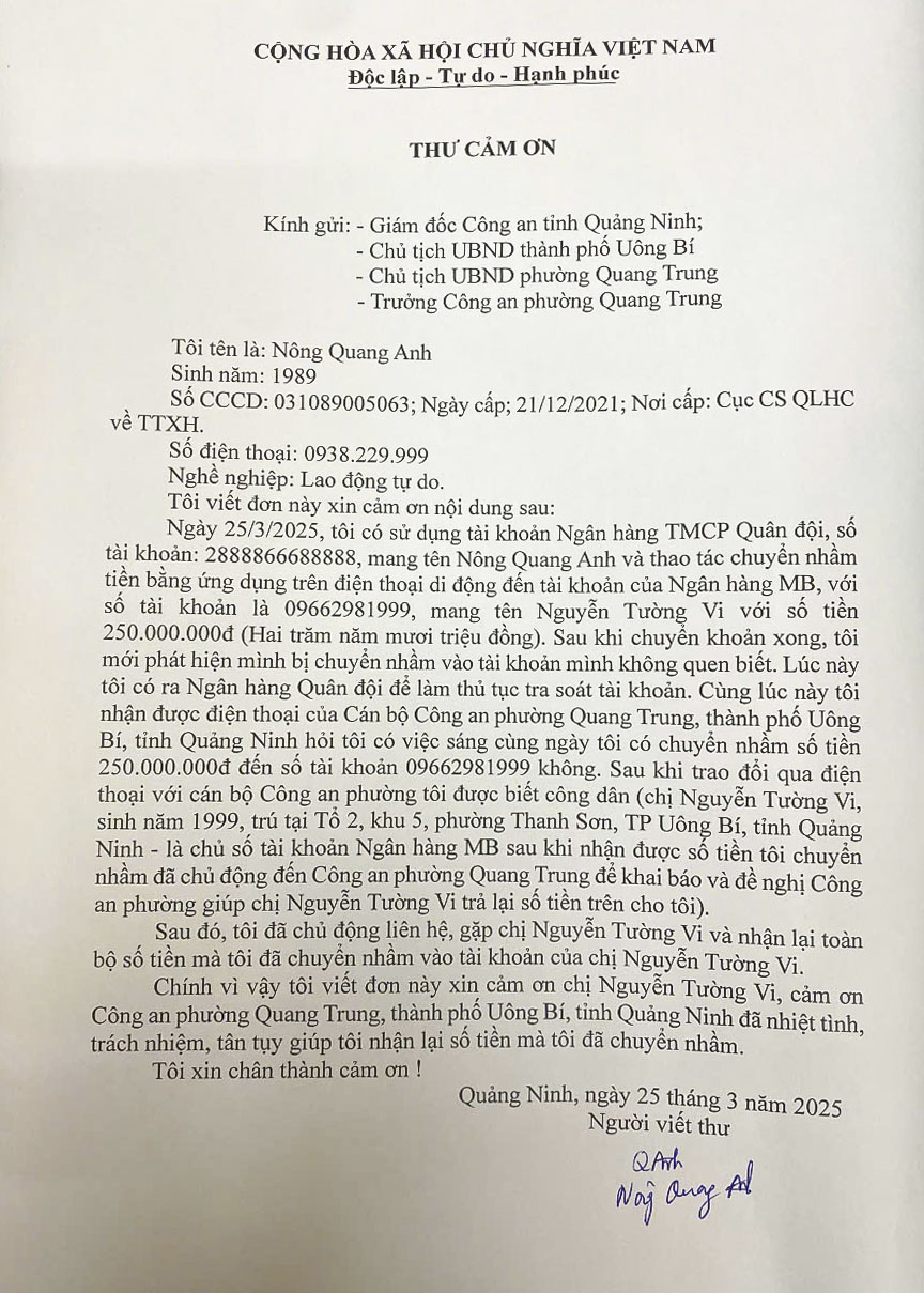 Công an phường Quang Trung, thành phố Uông Bí, tỉnh Quảng Ninh vừa nhận được thư cảm ơn từ anh Nông Quang Anh (SN 1989, trú tại Tổ 14, Bắc Sơn, Kiến An, TP Hải Phòng) sau khi được hỗ trợ nhận lại số tiền 250 triệu đồng do chuyển nhầm vào tài khoản của một công dân tại Uông Bí.
