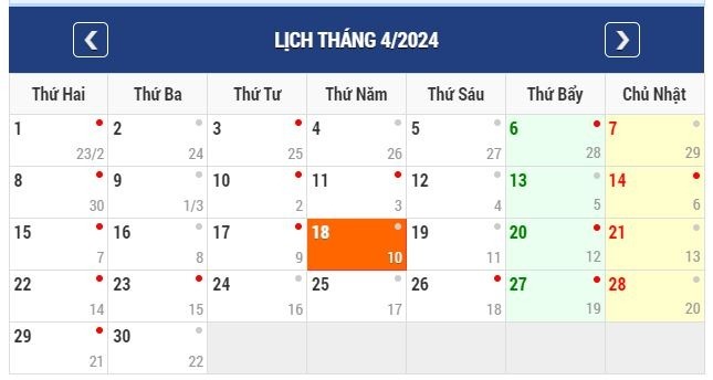 Cụ thể, theo Bộ luật Lao động 2019, trong năm 2024, người lao động có 6 dịp nghỉ lễ, tết chính, trong đó có ngày Giỗ Tổ Hùng Vương là 1 ngày (ngày 10/3 âm lịch). Năm nay, ngày 10/3 năm Giáp Thìn 2024 rơi vào ngày 18/4/2024 (Dương lịch).