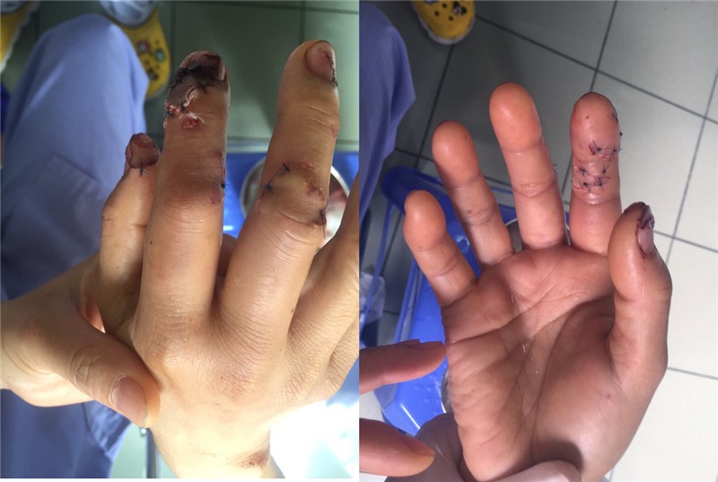 Người bệnh là Nguyễn Thị V. 44 tuổi, trú tại Hải Hòa - Móng Cái. Trước đó tại gia đình, chị và người nhà có sử dụng máy xay sinh tố. Trong khi kiểm tra phía trong máy thì người nhà nhỡ tay bấm vào nút xay, khiến ngón tay chị V. bị dập nát. Gia đình đã băng tạm, đưa chị tới một bệnh viện gần nhà và được chỉ định cắt bỏ 2 ngón tay này.