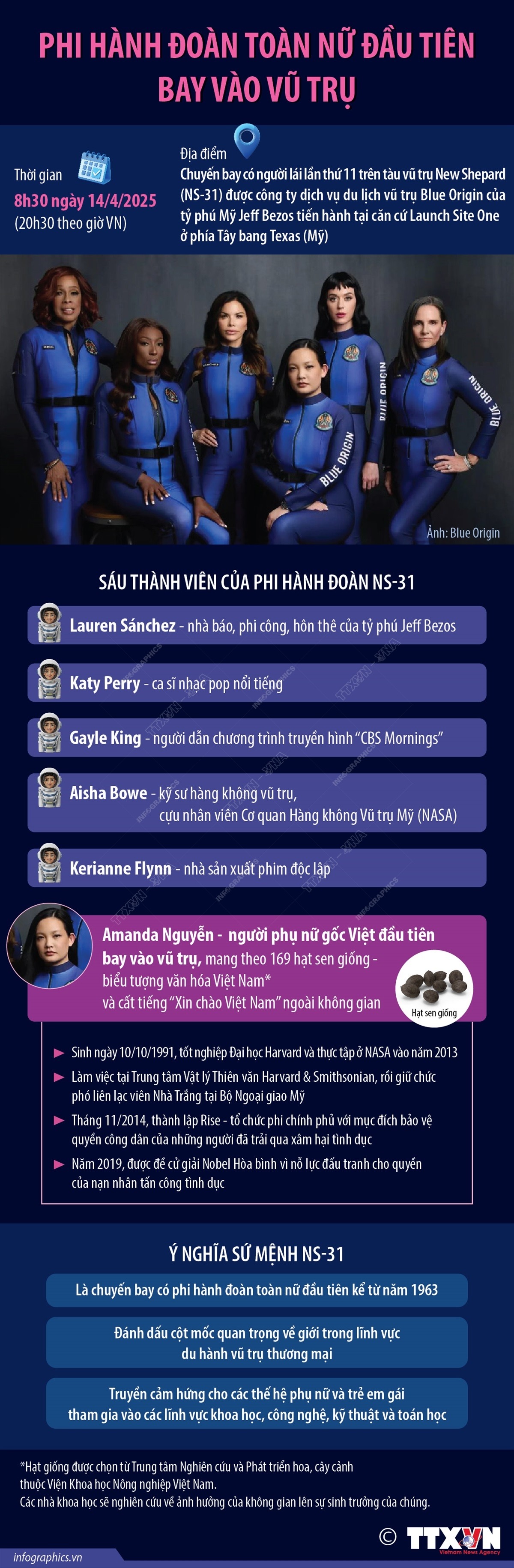 Sáng 14/4/2025 theo giờ địa phương (tối cùng ngày theo giờ Việt Nam), công ty dịch vụ du lịch vũ trụ Blue Origin của tỷ phú Mỹ Jeff Bezos đã thực hiện thành công chuyến bay có người lái lần thứ 11 trên tàu vũ trụ New Shepard (NS-31) với phi hành đoàn toàn nữ đầu tiên kể từ năm 1963.