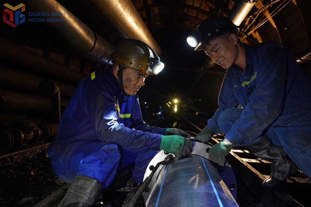 Anh Phạm Đình Duẩn (bên trái) hướng dẫn công nhân trẻ sửa chữa ống nước trong lò chợ.