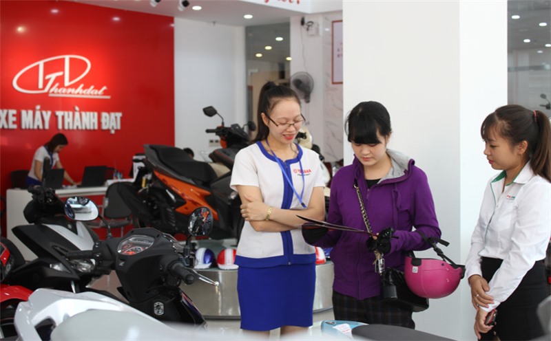 Nhân viên Công ty TNHH Ô tô xe máy Thành Đạt tư vấn cho khách hàng chọn xe.