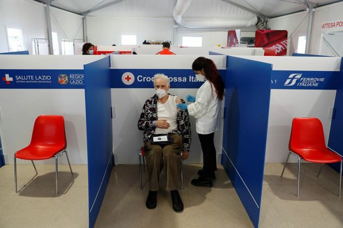 Một cụ ông tiêm vaccine Covid-19 tại trung tâm tiêm chủng của Hội Chữ thập đỏ ở Termini, Rome, Italy, ngày 24/11. Ảnh: Reuters