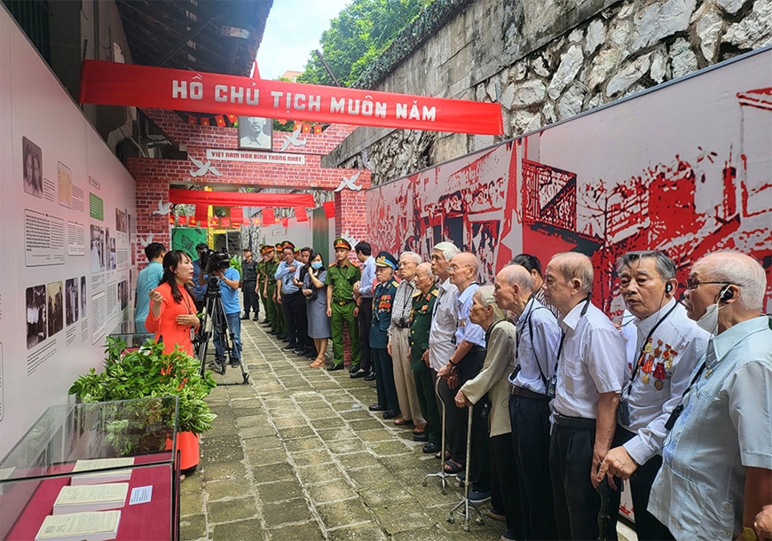 Các đại biểu là cựu tù chính trị tại Nhà tù Hỏa Lò tham quan trưng bày “Khúc ca khải hoàn” nhân kỷ niệm 68 năm Ngày giải phóng Thủ đô. Ảnh: Khánh Huyền