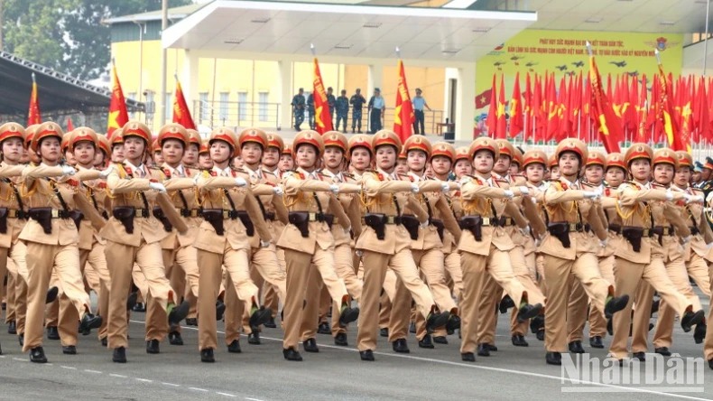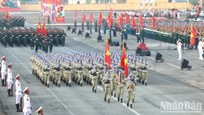 Dưới nền nhạc hào hùng, lần lượt 36 khối diễu binh thuộc lực lượng quân đội, công an, dân quân tự vệ, du kích lần lượt đi qua lễ đài.