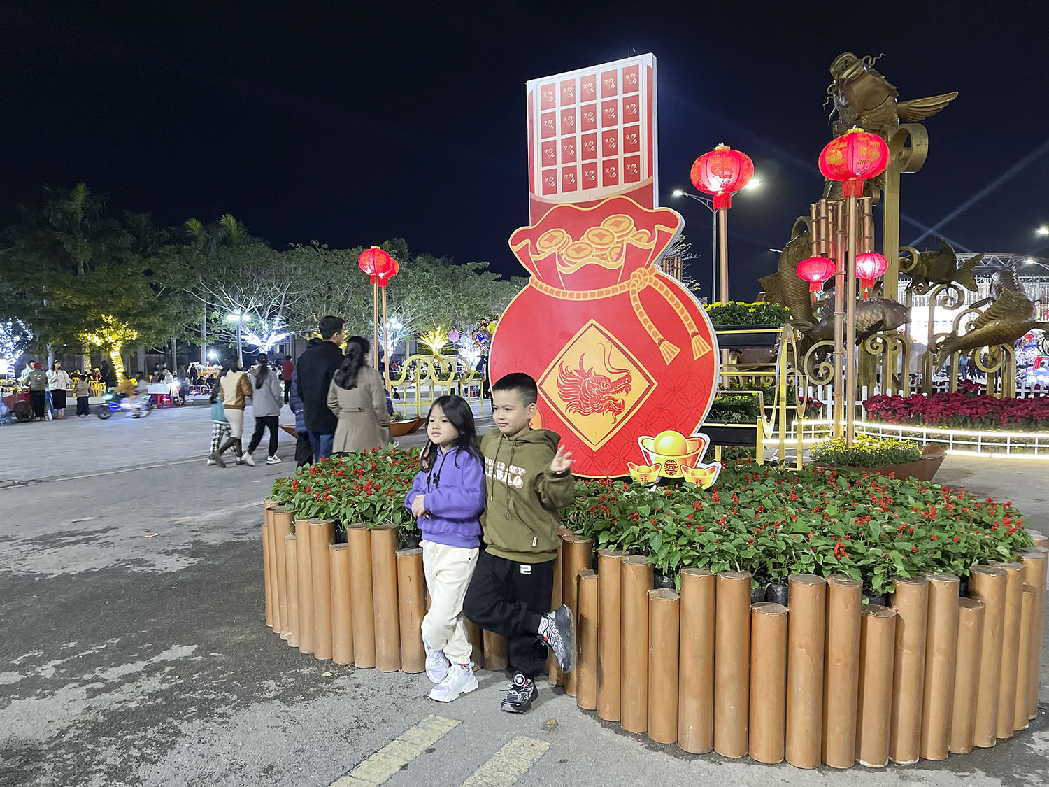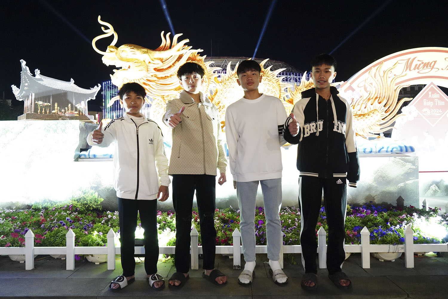 Tại khu vực Quảng trường 25/2, nơi diễn ra chương trình Nghệ thuật – Khiêu vũ, dân vũ – Dạ hội Thanh niên và bắn pháo hoa chào năm mới 2024 đặc biệt thu hút đông đảo người dân và du khách đến check-in. Khu vực trang trí biểu tượng Rồng là địa điểm được người dân lựa chọn chụp ảnh nhiều nhất, đặc biệt là các bạn trẻ. Không khí nhộn nhịp, rộn ràng đón xuân toát lên từ những nụ cười, ánh mắt rạng rỡ cùng những bộ trang phục sắc màu.