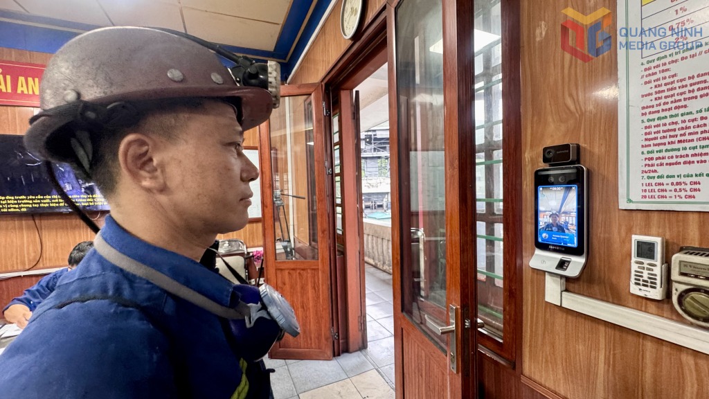 Công nhân Than Vàng Danh điểm danh bằng thiết bị nhận diện khuôn mặt và dấu vân tay tại nhà giao ca.
