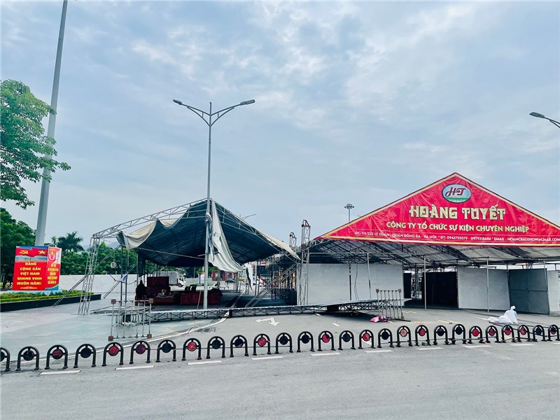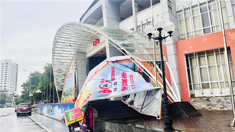 Mái che Hội chợ OCOP kết hợp thương mại năm 2023 tại Quảng trường 25/2 bị hư hỏng.