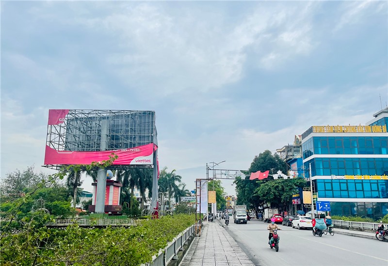 Biển quảng cáo tấm lớn tại khu vực cầu Sông Sinh bị gió xé nát.