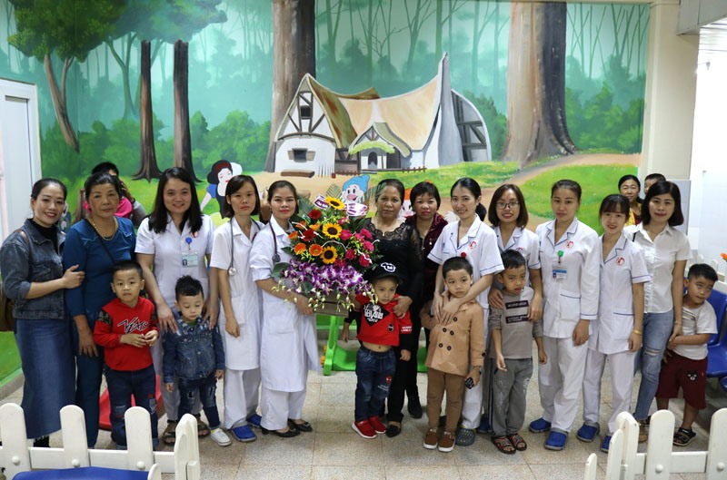 Đại diện các gia đình gửi những lẵng hoa chúc mừng đến các thầy thuốc Đơn vị tâm bệnh - Khoa Nhi.