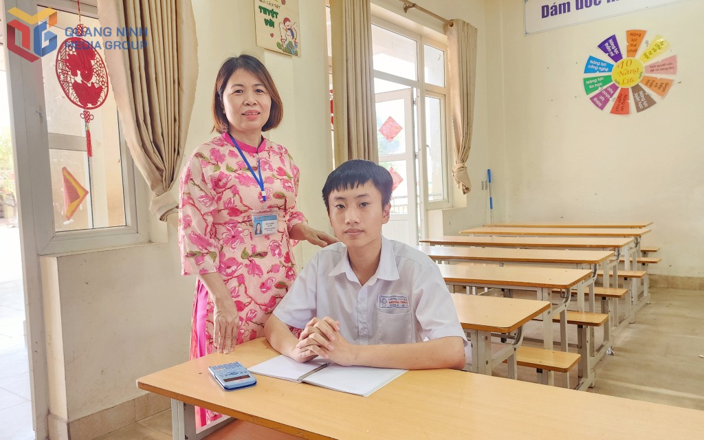 Bùi Minh Đức (lớp 9A1, Trường THCS Nguyễn Trãi) và cô giáo chủ nhiệm.