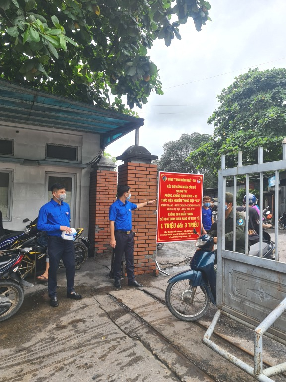 Trần Văn Đại (bên phải) hướng dẫn CBCN Công ty thực hiện các quy định phòng, chống dịch Covid-19.