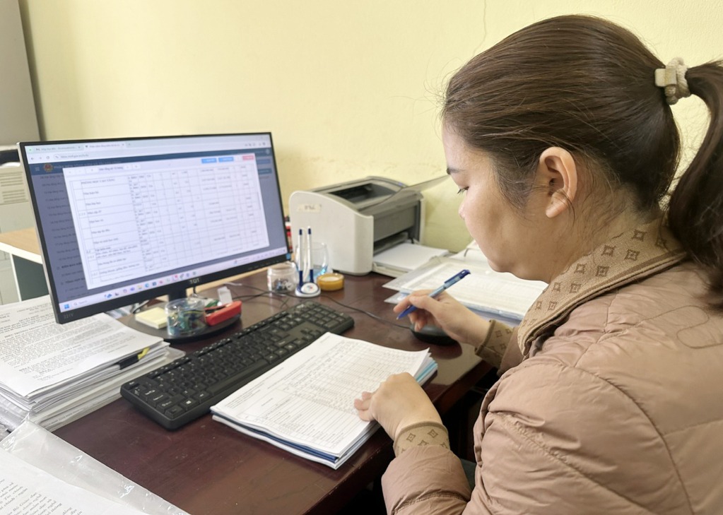 Nhân viên Trường THCS Mạo Khê II rà soát số liệu kiểm kê.