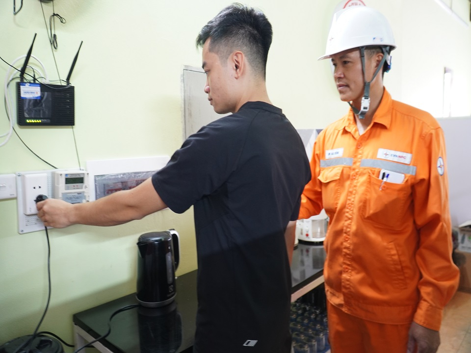 Công nhân Điện lực TP Hạ Long hướng dẫn khách hàng sử dụng điện, rút phích cắm ra khỏi nguồn điện đối với các thiết bị khi không sử dụng.
