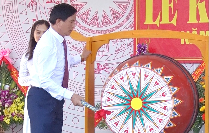 Đồng chí Nguyễn Xuân Ký, Ủy viên BTV Tỉnh ủy, Phó Chủ tịch Thường trực HĐND tỉnh gióng trống khai giảng năm học mới.