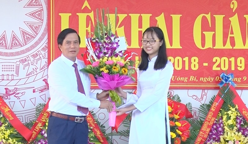 Cũng nhân dịp này, đồng chí Phó Chủ tịch UBND thành phố đã tặng hoa chúc mừng em Nguyễn Thu Huyền, thủ khoa kỳ thi tuyển sinh vào lớp 10 năm học 2018-2019 của THPT Uông Bí.