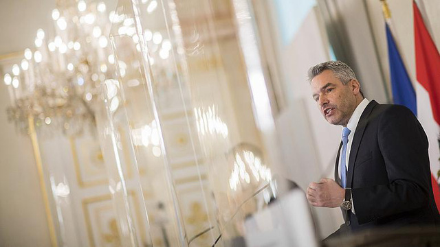 Thủ tướng Áo Karl Nehammer trình bày dự thảo quy định bắt buộc tiêm phòng COVID-19 tại một cuộc họp báo ở Vienna. Nguồn ảnh: AP