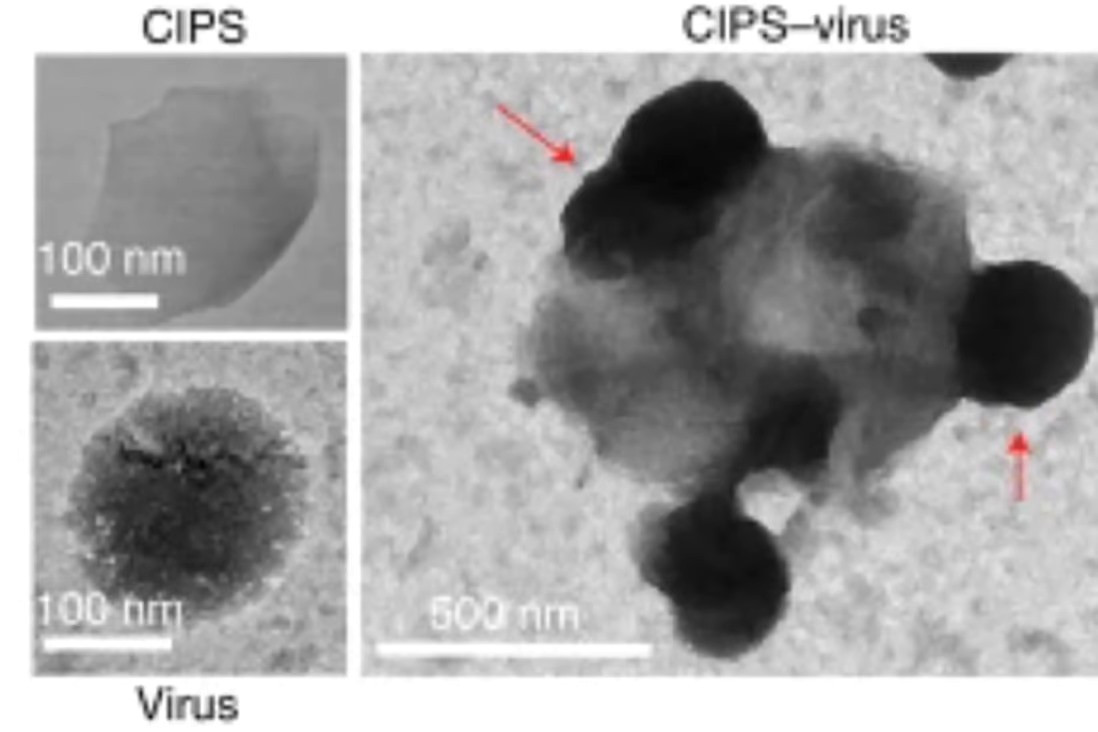 Hình ảnh mô tả sự tương tác giữa virus SARS-CoV-2 và CIPS. Các mũi tên màu đỏ chỉ ra các phần tử virus bám vào CIPS. Các nhà nghiên cứu Trung Quốc cho biết vật liệu nano CIPS đóng vai trò như "bẫy virus". Ảnh: Nature Nanotechnology