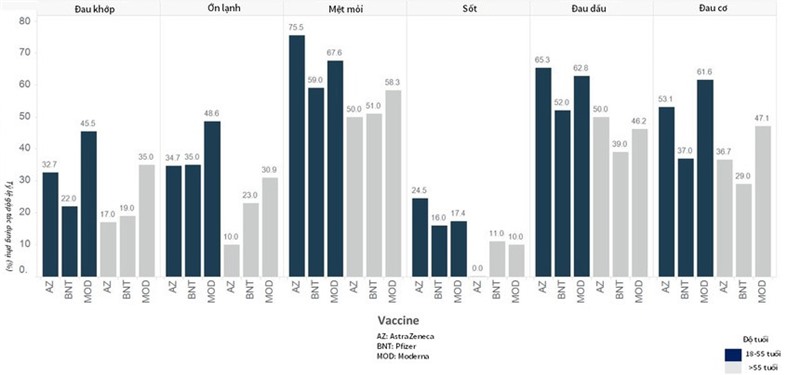 Trong số các triệu chứng sau tiêm, tình trạng thường gặp nhất là mệt mỏi. Dấu hiệu này được ghi nhận ở người tiêm 18-55 tuổi lần lượt là 75,5%, 59% và 67,6%, tương ứng ba loại vaccine AstraZeneca, Pfizer, Moderna. Tương tự, đây cũng là triệu chứng phổ biến nhất ở người tiêm trên 55 tuổi với tỷ lệ gặp phải lần lượt là 50%, 51%, 58,3%.