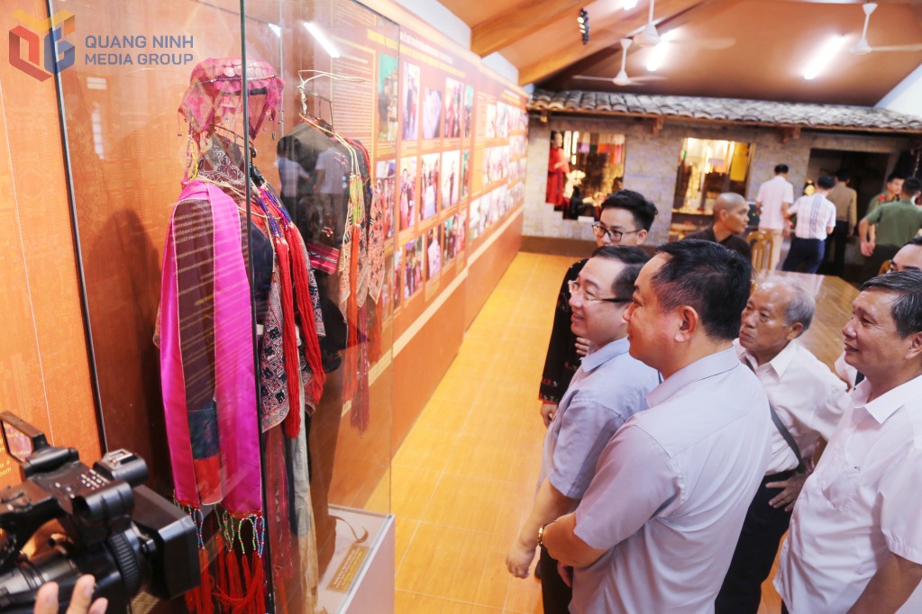 Các đồng chí lãnh đạo tỉnh và TP Uông Bí tham quan Nhà trưng bày không gian văn hóa người Dao Thanh Y (thôn Khe Sú 2, xã Thượng Yên Công).