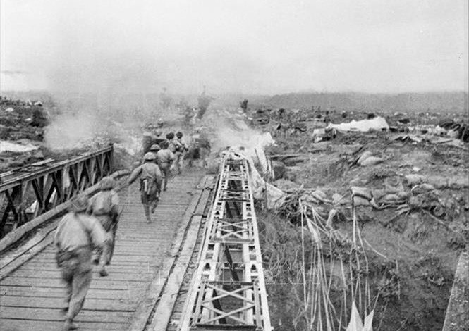 Bộ đội ta vượt qua cầu Mường Thanh, tấn công vào Sở chỉ huy Tập đoàn cứ điểm Điện Biên Phủ, chiều 7/5/1954. Ảnh Tư liệu