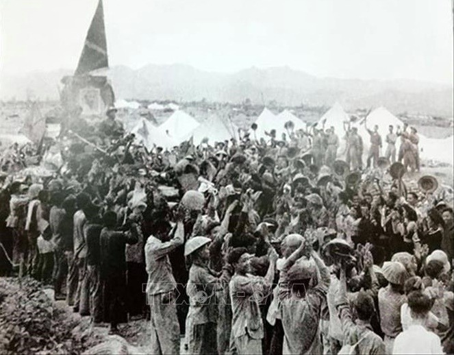 Lá cờ “Quyết chiến Quyết thắng” và chân dung Chủ tịch Hồ Chí Minh tại lễ diễu hành mừng chiến thắng tại Điện Biên Phủ giữa tiếng reo hò vang dậy của bộ đội, dân công và nhân dân các dân tộc Điện Biên. Ảnh tư liệu
