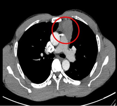 Kết quả chụp CT scanner ngực cho thấy hình ảnh khối u trung thất trước (Vùng khoanh tròn màu đỏ)