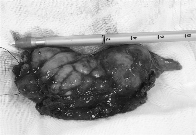 Khối u trung thất trước kích thước 11x5cm sau khi được cắt bỏ.