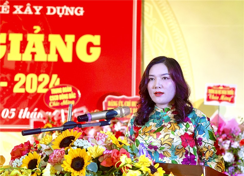 Tiến sĩ Nguyễn Thị Hoài, Phó Bí thư Đảng uỷ, Hiệu trưởng Trường Cao đẳng nghề xây dựng phát biểu tại lễ khai giảng.