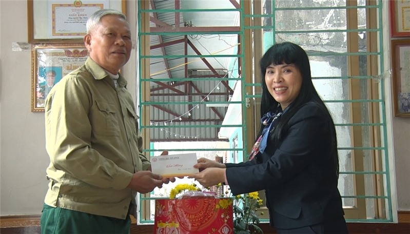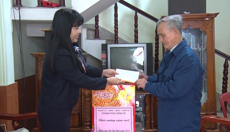 Đồng chí Phó Bí thư Thường trực Thành ủy Uông Bí tặng quà Tết cho nạn nhân chất độc da cam Vũ Văn Khấm.