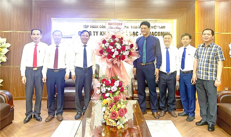 Đồng chí Nguyễn Chiến Thắng, Phó Bí thư Thường trực Thành uỷ cùng đoàn tặng hoa chúc mừng Công ty Kho vận Đá Bạc - Vinacomin.