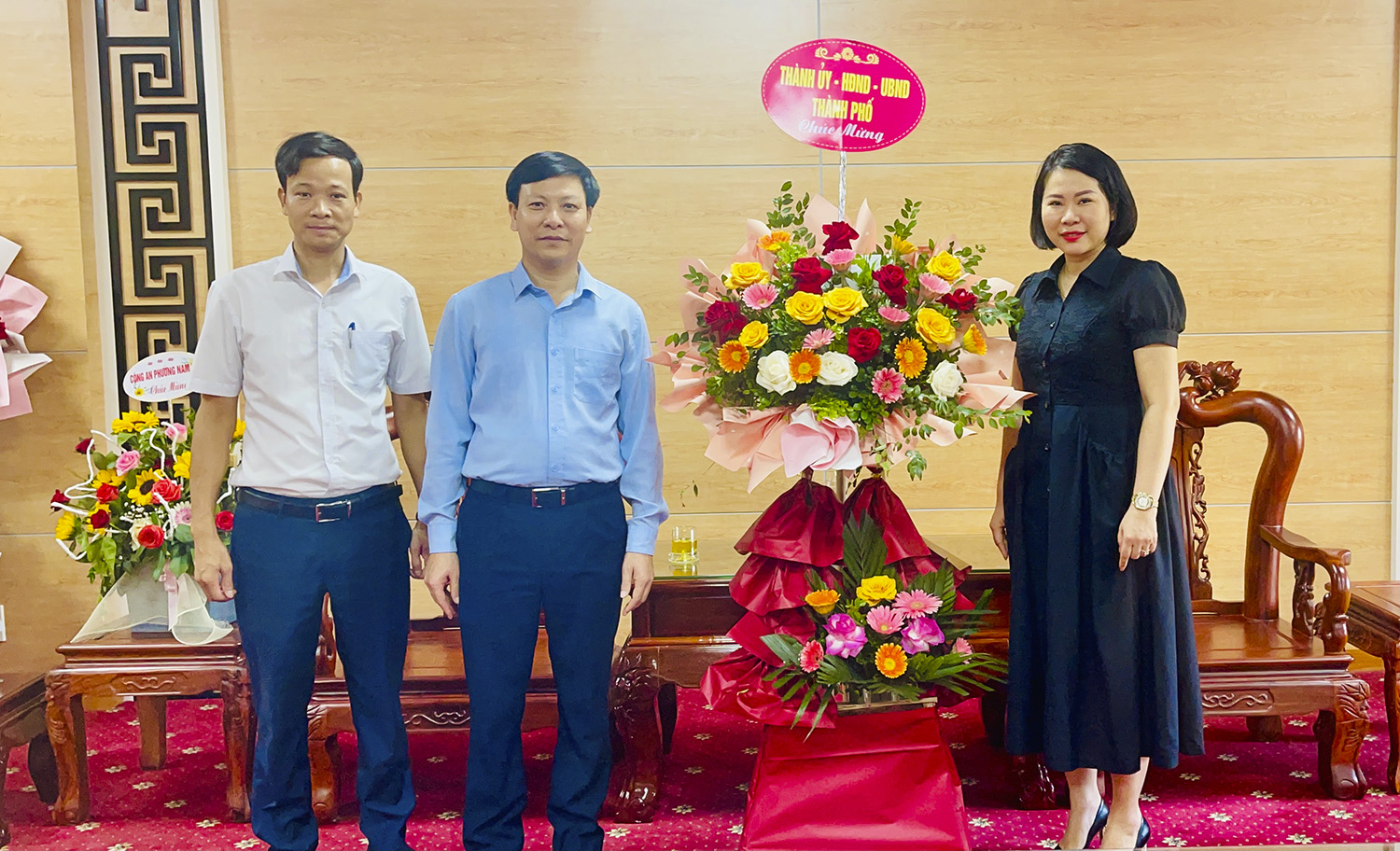 Phó Chủ tịch HĐND thành phố Đỗ Trường Sơn tặng hoa chúc mừng cán bộ, giảng viên Trường Đại học Hạ Long.