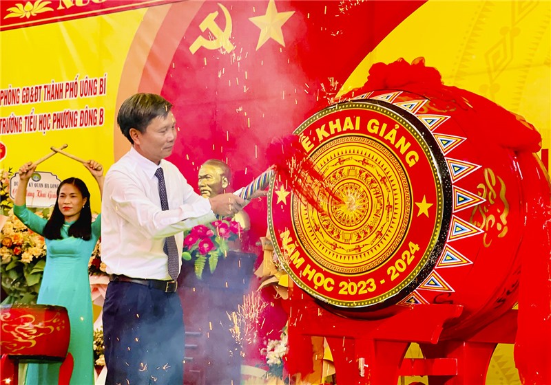 Đồng chí Nguyễn Văn Thành, Uỷ viên BTV Thành ủy, Phó Chủ tịch Thường trực UBND thành phố gióng trống khai giảng năm học 2023-2024 tại trường Tiểu học Phương Đông B.
