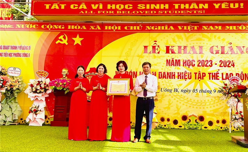 Tại buổi lễ, đồng chí Nguyễn Văn Thành, Uỷ viên BTV Thành ủy, Phó Chủ tịch Thường trực UBND thành phố đã gióng trống khai giảng năm học mới, tặng hoa chúc mừng và trao Bằng công nhận danh hiệu Tập thể lao động xuất sắc năm học 2022-2023 cho thầy và trò nhà trường.