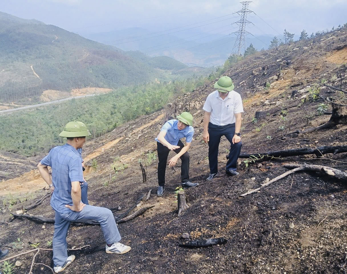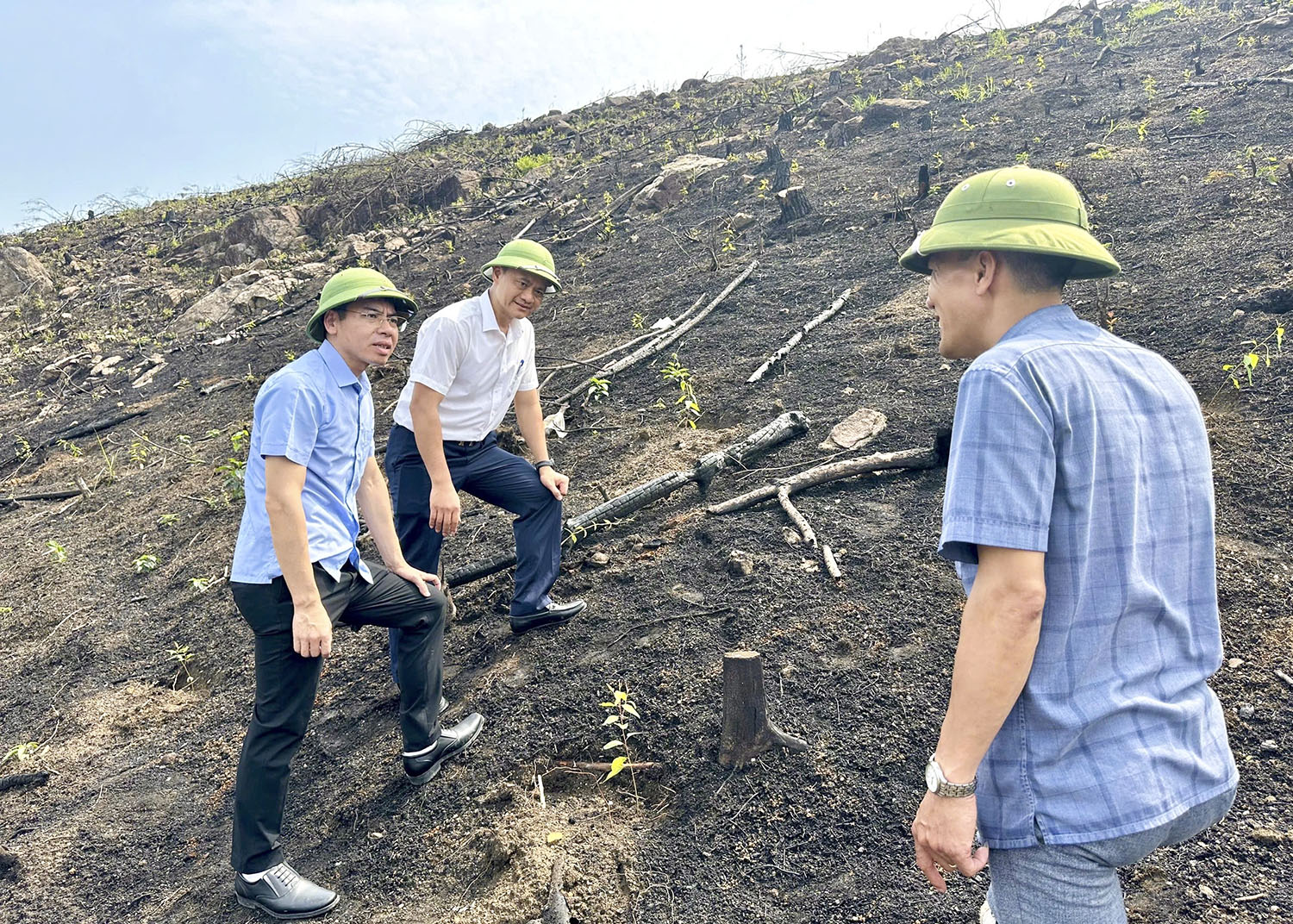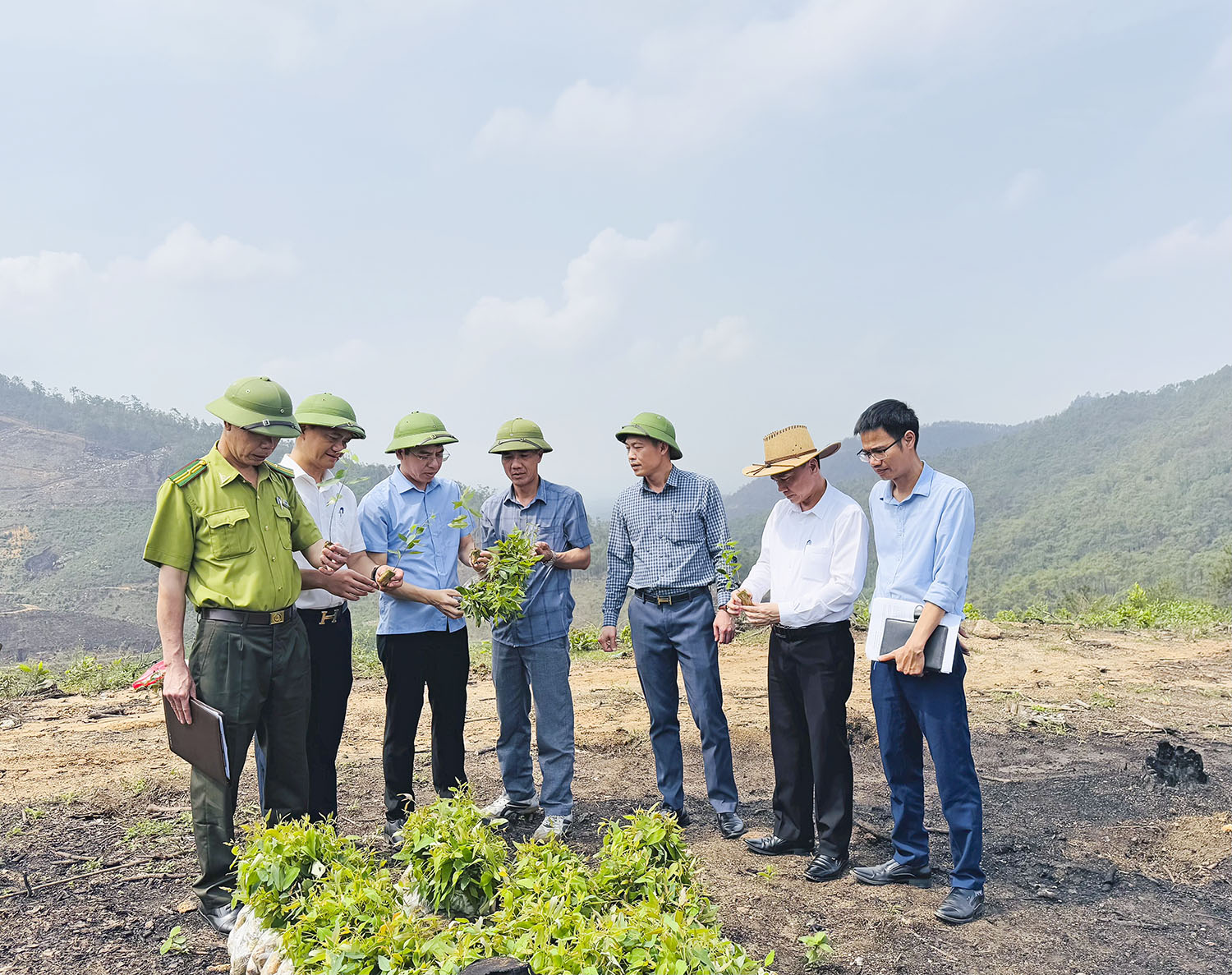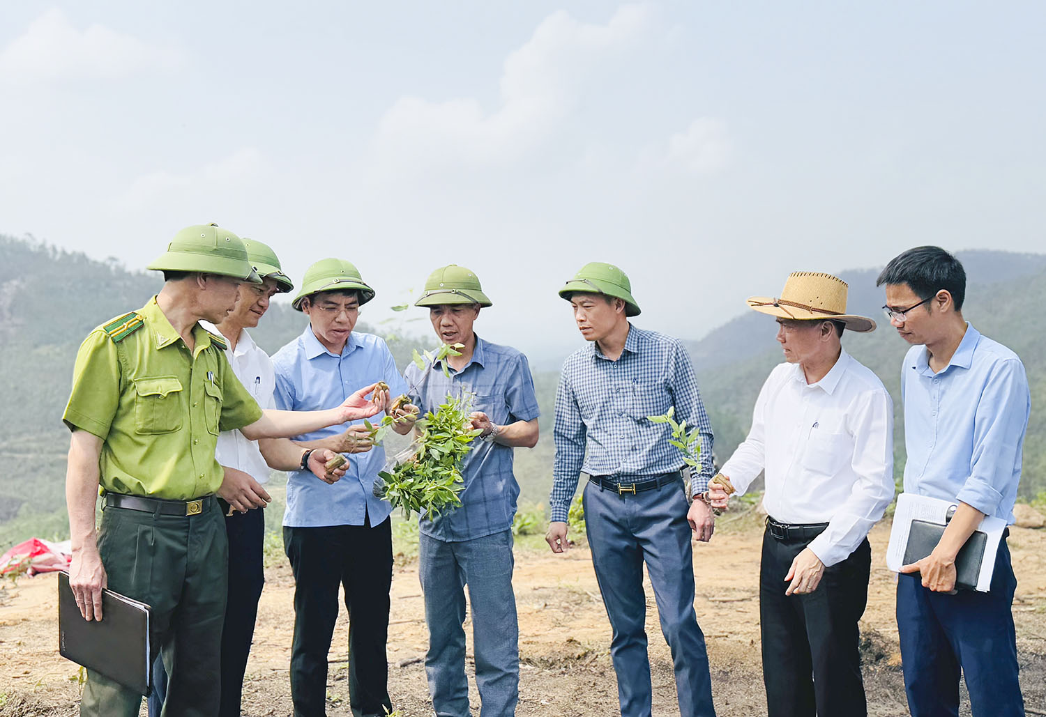 Đồng chí Nguyễn Đức Hoà, Phó Chủ tịch UBND thành phố kiểm tra tình hình tái sinh rừng và phục hồi rừng sau thiệt hại do thiên tai tại khu vực trồng rừng mới.