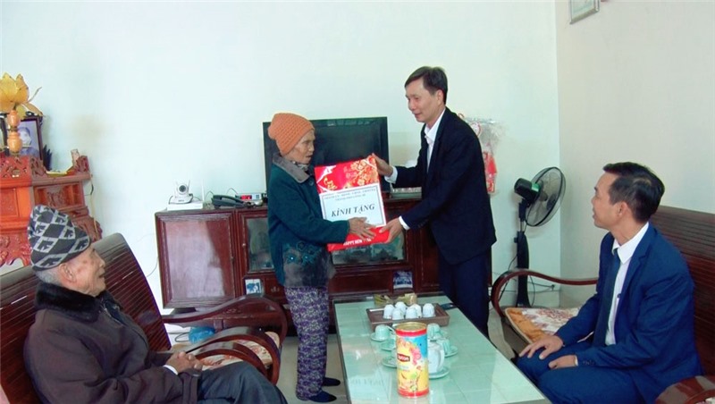 Đồng chí Phó Chủ tịch UBND thành phố tặng quà Tết bà Nguyễn Thị Bảy - người hoạt động kháng chiến, huy hiệu 70 năm tuổi đảng tại xã Thượng Yên Công.
