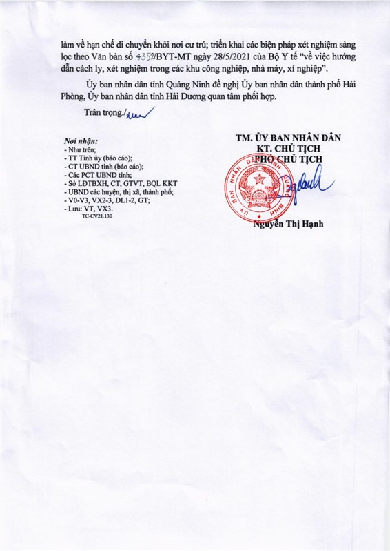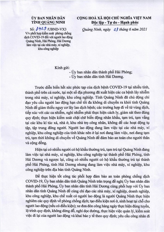 Vừa qua, Ủy ban nhân dân tỉnh Quảng Ninh ban hành văn bản số 3409/UBND-DL1 về việc phối hợp kiểm soát phòng chống dịch COVID-19 đối với người lao động Quảng Ninh, Hải Phòng, Hải Dương làm việc tại các nhà máy, xí nghiệp, khu công nghiệp.