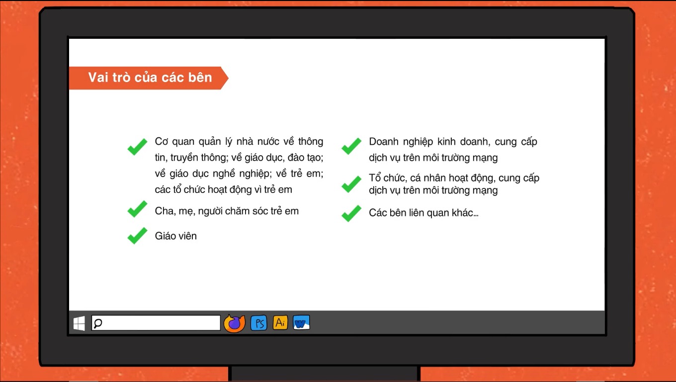 - Cơ quan quản lý nhà nước về thông tin, truyền thông; về giáo dục, đào tạo; về giáo dục nghề nghiệp; về trẻ em; các tổ chức hoạt động vì trẻ em