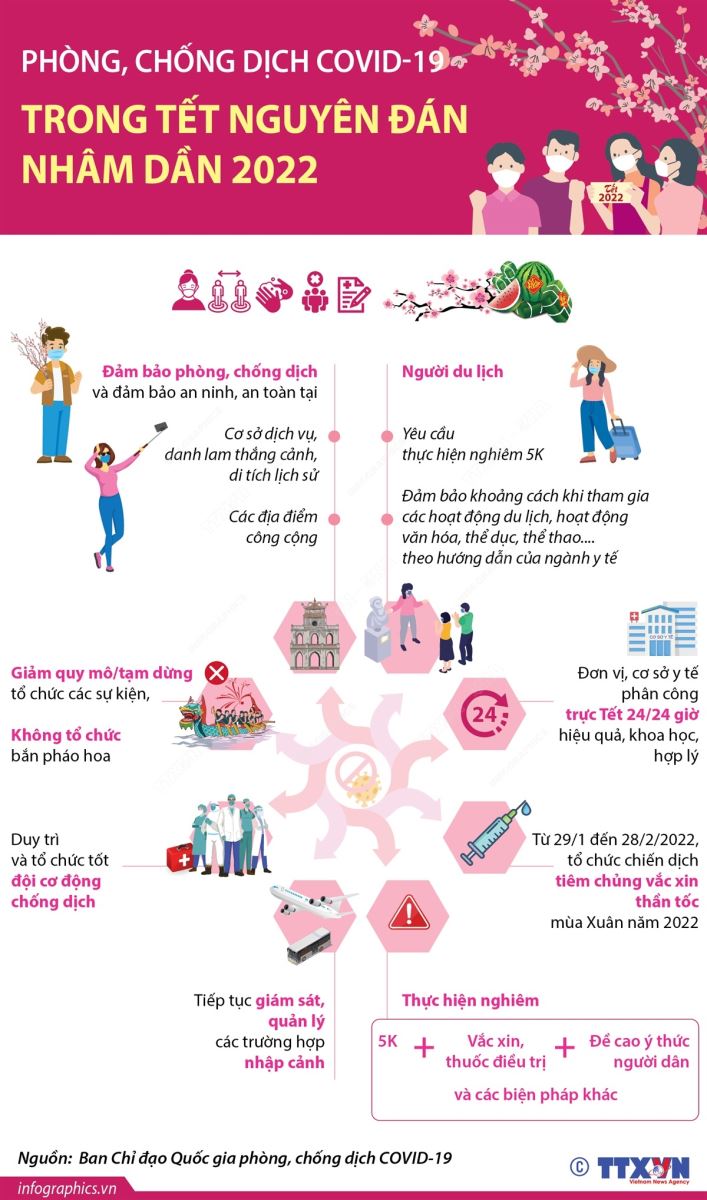 Ban Chỉ đạo Quốc gia phòng, chống dịch COVID-19 đã đề ra các biện pháp, chống dịch COVID-19 trong Tết Nguyên đán Nhâm Dần 2022. Theo đó, trong dịp Tết Nguyên đán, người dân cần thực hiện nghiêm "5K" (khẩu trang, khử khuẩn, khoảng cách, không tụ tập, khai báo y tế) + vắc xin, thuốc điều trị + đề cao ý thức và các biện pháp khác.