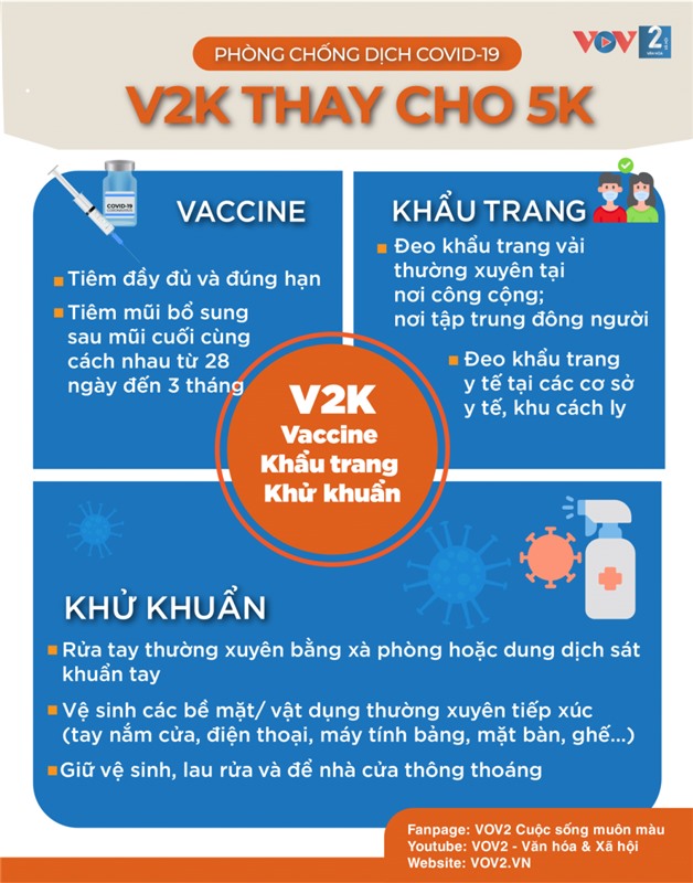 Bộ Y tế đề xuất V2K (vaccine – khẩu trang – khử khuẩn) thay thông điệp 5K và đã lấy ý kiến các thành viên Ban Chỉ đạo quốc gia về phòng, chống dịch Covid-19 và trình Chính phủ.