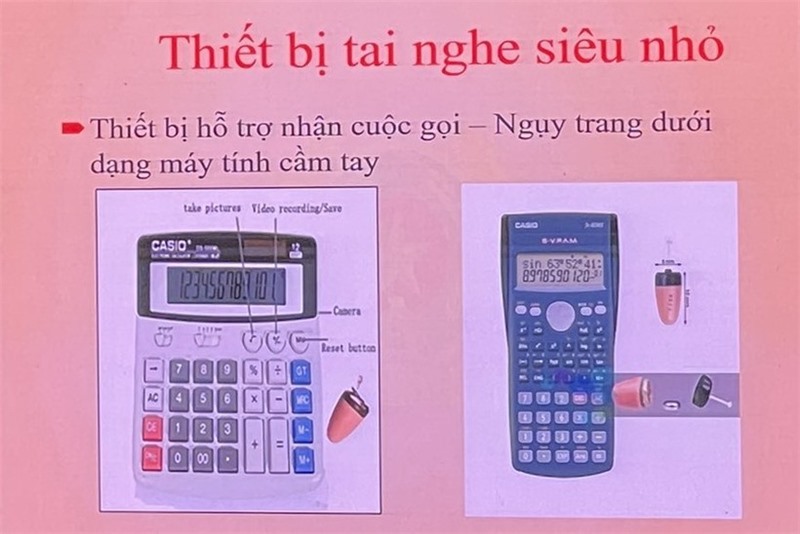 Có 2 cách để thí sinh chuyển đề thi ra bên ngoài từ thiết bị này đó là: đọc đề qua micro gửi ra ngoài hoặc từ camera siêu nhỏ chụp gửi ra ngoài. Sau đó, bên ngoài hướng dẫn vào qua tai nghe siêu nhỏ hoặc qua các màn hình chiếu nội dung văn bản. Tai nghe siêu nhỏ thường có kích thước 6-10 mm, pin 2 mm trong tai nghe. Ngoài ra còn có các thiết bị khác hỗ trợ nhận cuộc gọi ngụy trang dưới dạng thẻ ATM, ngụy trang dưới dạng bút viết, máy tính.