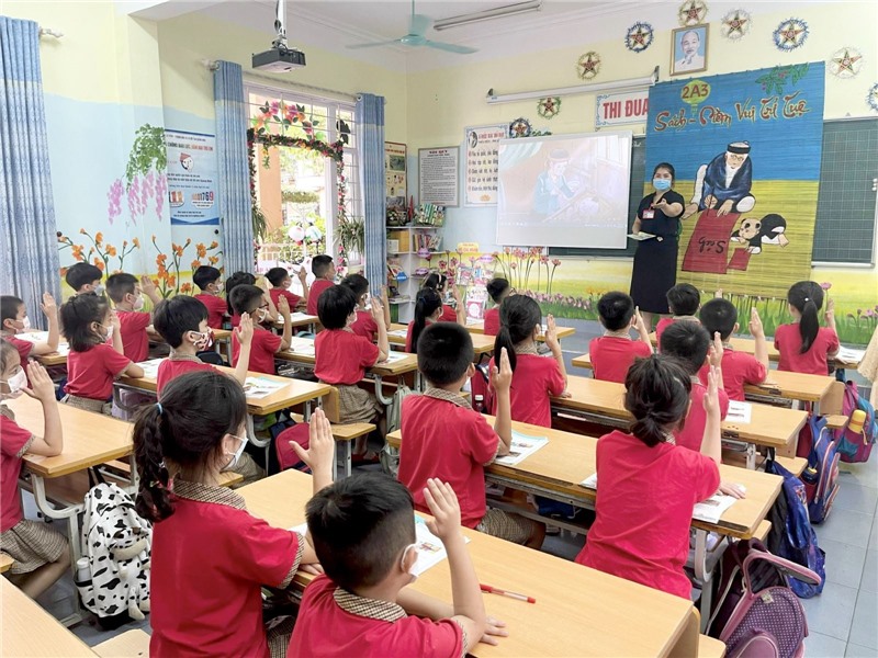Học sinh lớp 2A3, trường tiểu học Lê Lợi hào hứng tham gia buổi học tương tác với màn hình.