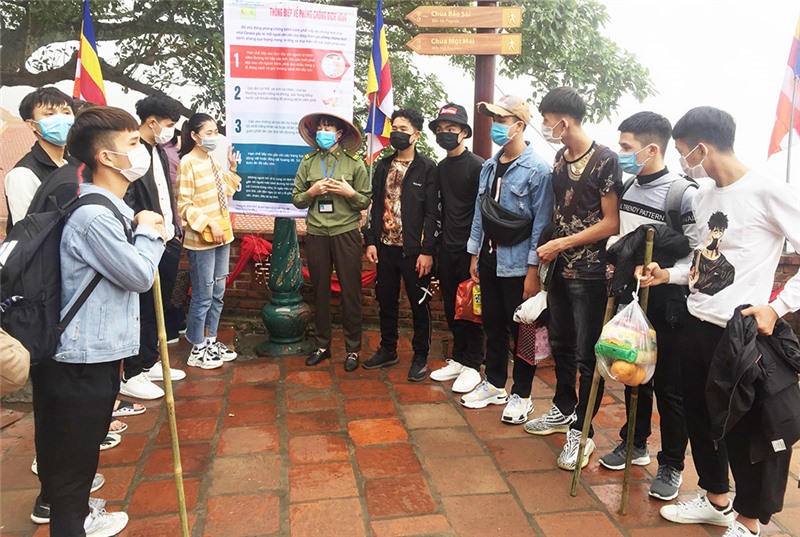 Nhân viên BQL Di tích và Rừng Quốc gia Yên Tử nhắc nhở du khách thực hiện đeo khẩu trang khi vào di tích.