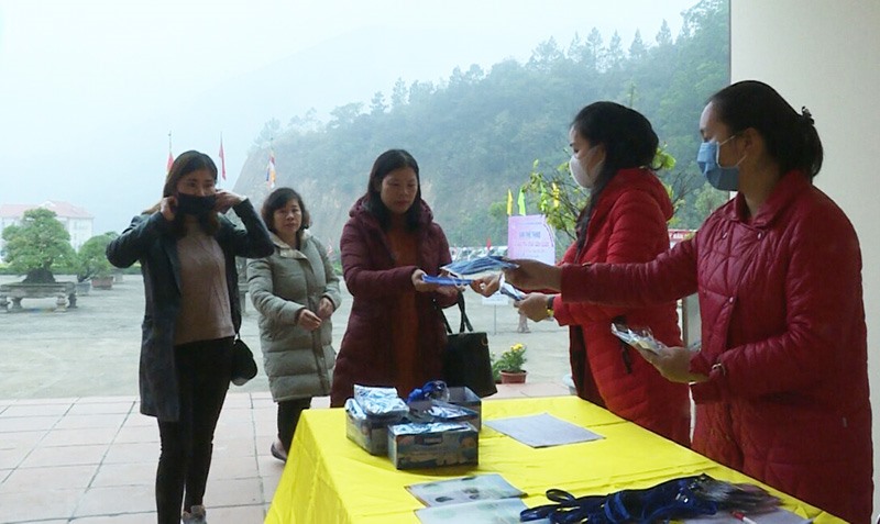 Du khách đến Ngọa Vân được nhận khẩu trang miễn phí.