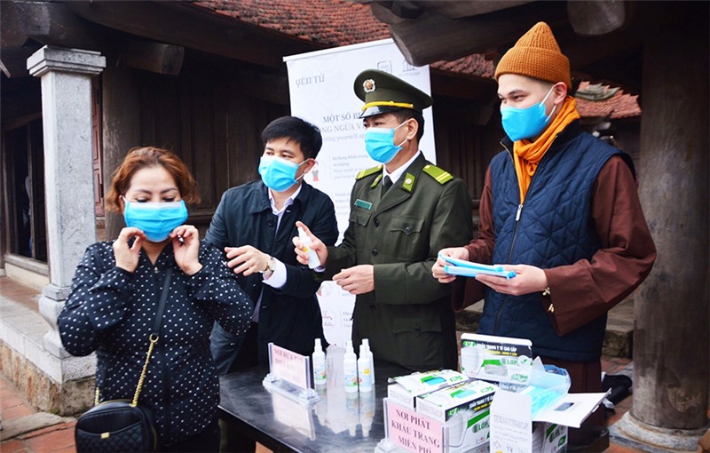 Với tinh thần trách nhiệm cao, trong thời điểm khan hiếm, loạn giá khẩu trang, hóa chất sát khuẩn… nhiều nhà chùa, các hội phật tử, các doanh nghiệp sẵn sàng trích kinh phí từ tiền công đức, huy động quyên góp của các phật tử hoặc kinh phí của doanh nghiệp để mua và phát miễn phí các vật dụng y tế này cho du khách; đồng thời phun tiêu độc, khử trùng toàn vùng di tích cũng như in ấn, đóng khung nhiều bảng, biển để cảnh báo du khách về dịch bệnh…