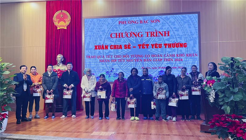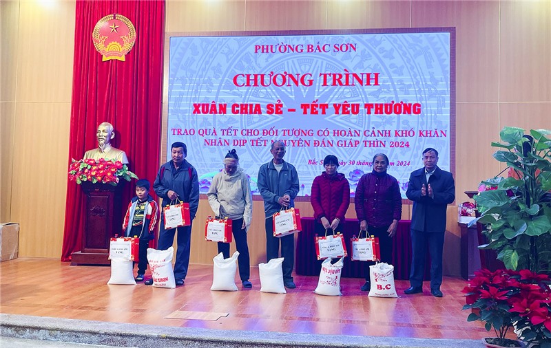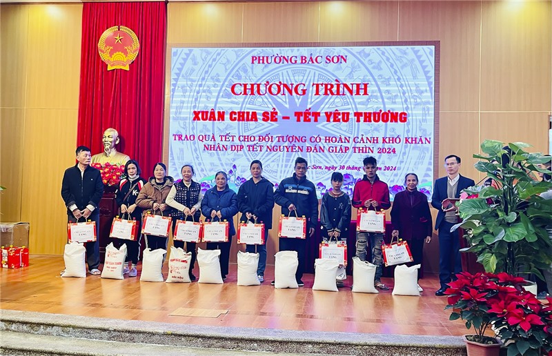 Ngày 30/01, phường Bắc Sơn tưng bừng tổ chức Chương trình Xuân sẻ chia - Tết yêu thương, trao quà Tết cho các đối tượng có hoàn cảnh khó khăn trên địa bàn nhân dịp Tết Nguyên đán Giáp Thìn 2024.
