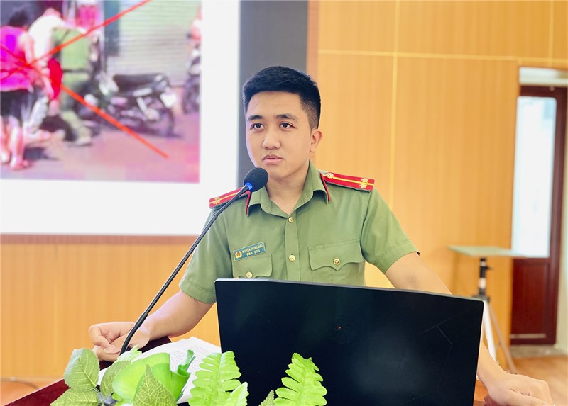 Cán bộ nghiệp vụ, Đội An ninh, Công an thành phố tuyên truyền pháp luật về an ninh mạng.